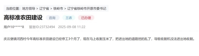 几天前,老富还对着村里的一条“断头路”发愁。“之前高标准农田建设施工,把进出玉米地的路给挖断了。本想等工程结束就能修复,没想到项目突然停工,路也就没人管了。”情急之下,9月8日,老富通过人民网“领导留言板”给开原市委书记写下了自己的焦虑,“高标准农田建设已停工3个月,进出玉米地的道路被挖坏,即将秋收,收割机却无法进入,这可咋办?”